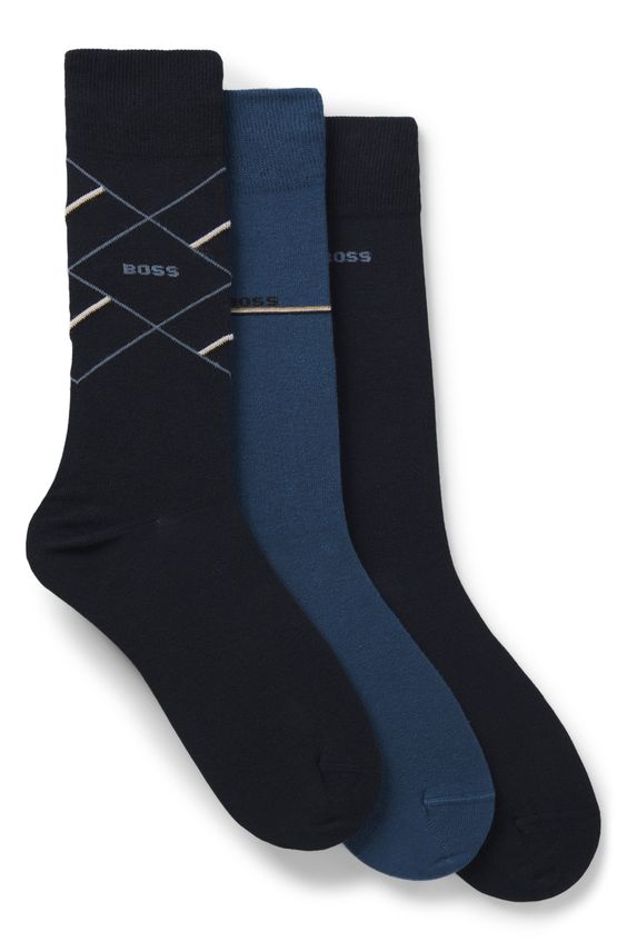 BOSS 50547840-401 Dark Blue er en værdifuld strømpepakke bestående af tre par i mørkeblå og lyseblå nuancer, designet til at supplere både formelle og afslappede outfits. Hvert par er fremstillet med 72 % bomuld, 23 % polyester, 3 % polyamid og 2 % elastan for at sikre en balance mellem komfort, strækbarhed og holdbarhed. Forstærkninger ved hæl og tå gør dem ekstra robuste og velegnede til dagligt brug. Pakken kombinerer ensfarvede og mønstrede designs, så du har fleksibilitet i styling. Med deres regular længde passer disse sokker til både jakkesætssko og dagligt fodtøj, og de fungerer godt hele året rundt