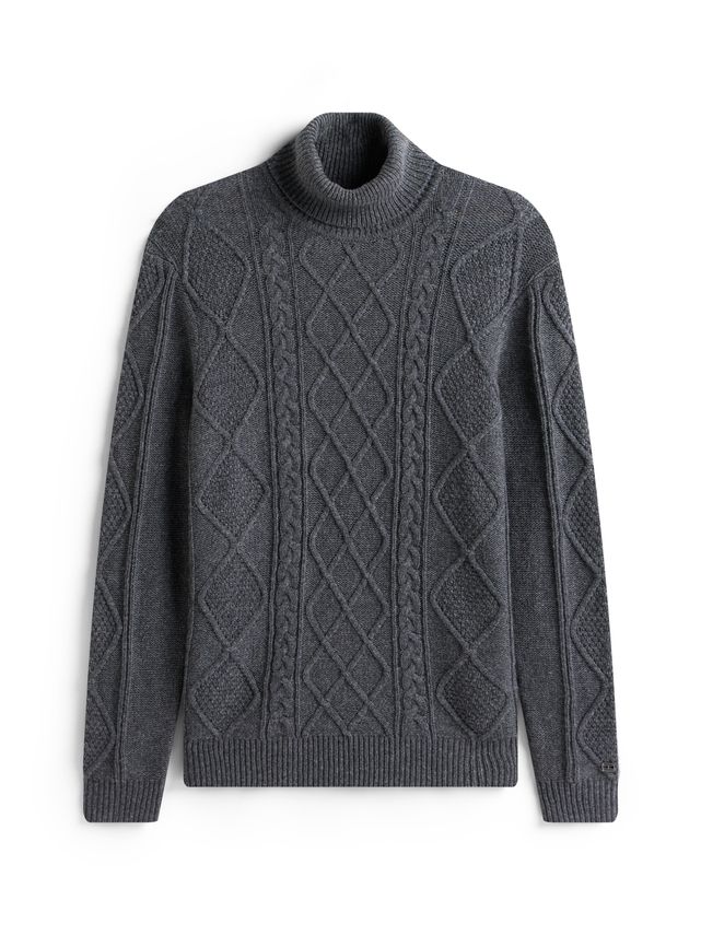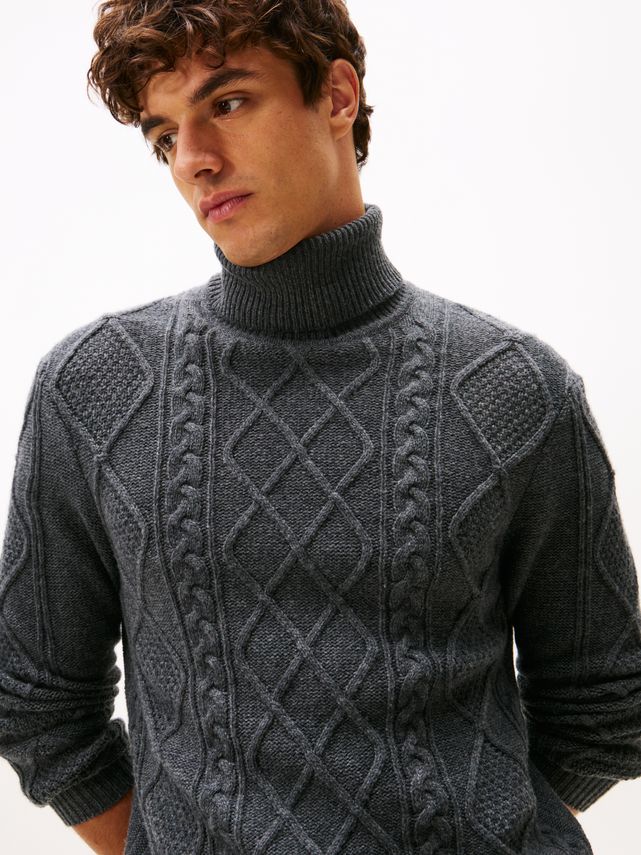 Tommy Hilfiger MW0MW40914-P92 i farven Dark Grey H er en luksuriøs kabelstrikket rullekravesweater, der kombinerer klassisk design med moderne komfort. Fremstillet i en varm og blød blanding af 90 % uld og 10 % cashmere, tilbyder denne sweater både varme og åndbarhed. Den mørke grå melange farve giver et tidløst og alsidigt udtryk, der nemt kan styles til forskellige anledninger. Sweateren har en relaxed fit med let dropped shoulder, hvilket giver en afslappet og moderne silhuet. Ribstrikkede kanter ved hals, ærmer og talje tilføjer struktur og komfort. Et diskret Tommy Hilfiger-logo på ærmet fuldender det stilrene design. Denne sweater er ideel til både arbejdsdage og afslappede weekender, og kan kombineres med chinos eller jeans for et komplet look.