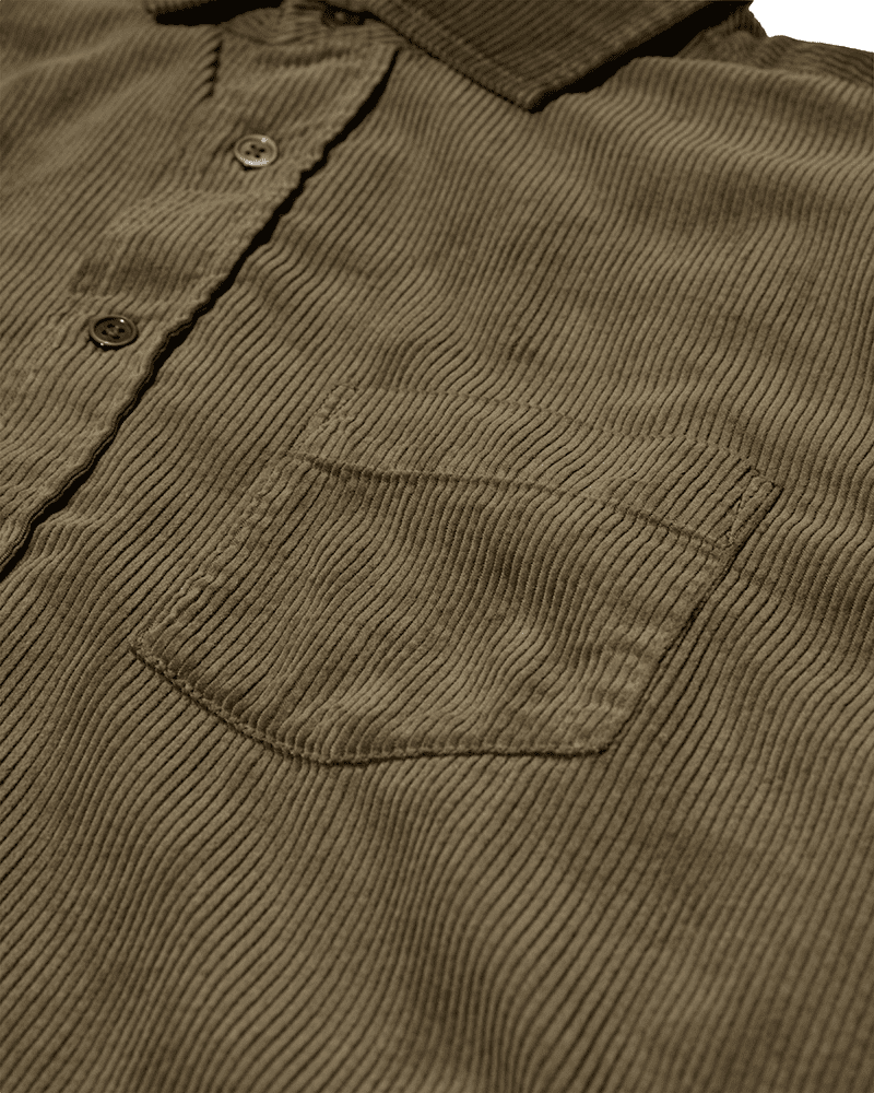 Mos Mosh Gallery præsenterer Alden Corduroy Shirt i modellen 506170-507 med farven Grape Leaf – en varm, grøn nuance med jordagtig karakter. Skjorten er fremstillet i 100 % bomuld og vævet i blød corduroy, hvilket giver den en let tekstureret følelse og et mere rig til look end almindeligt skjortestof. Den klassiske knaplukning, brystlomme og ståkrave giver den elegante, men afslappede skjorteprofil.