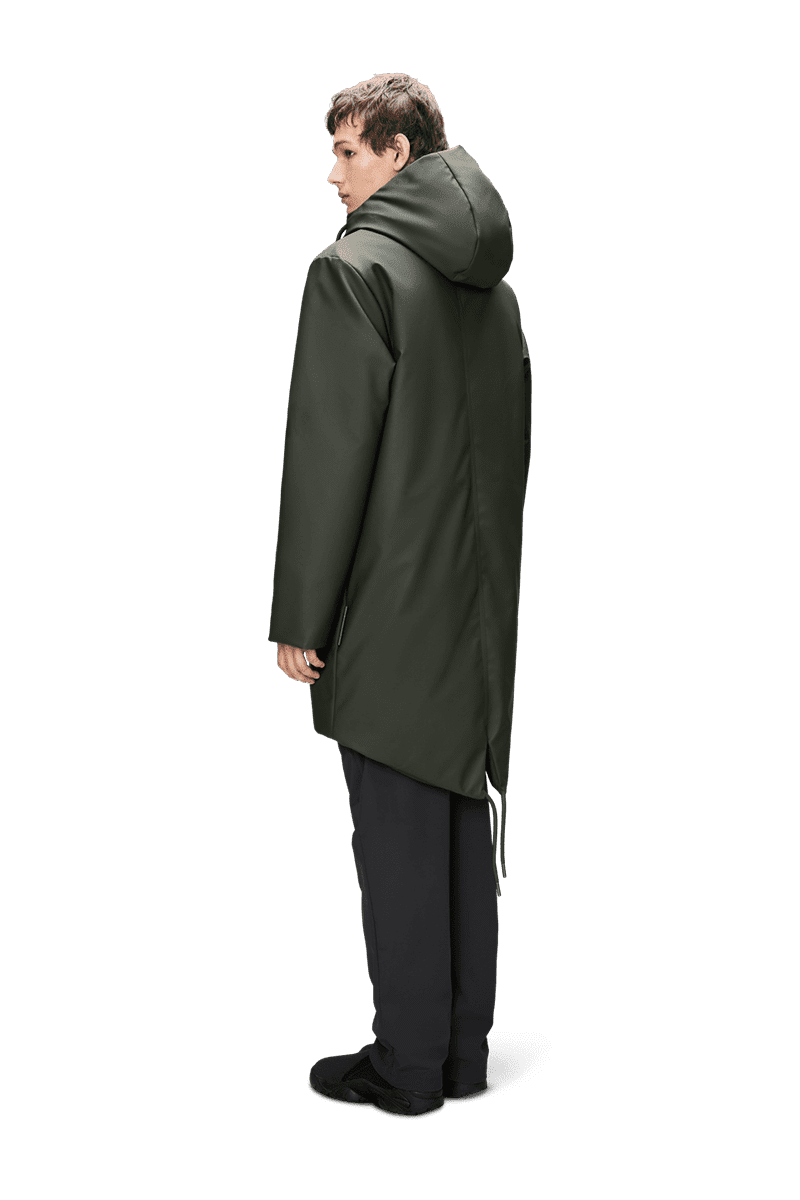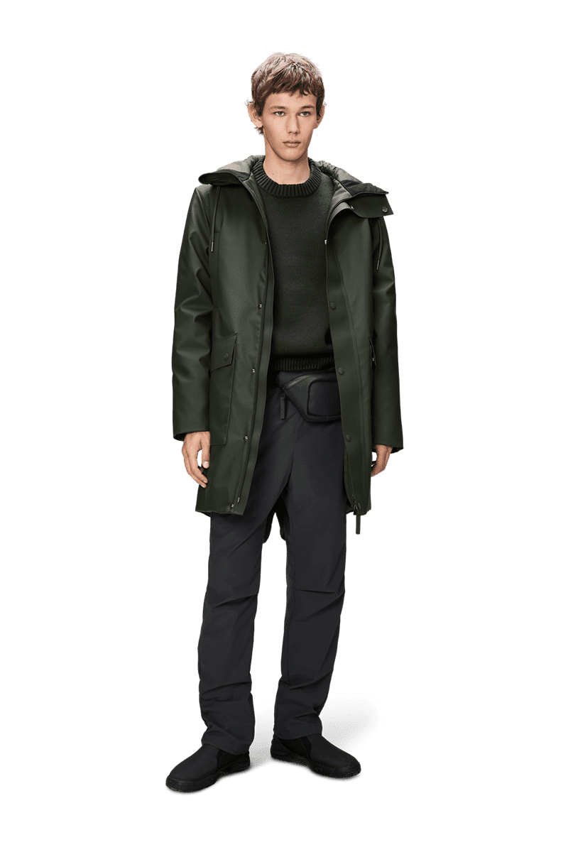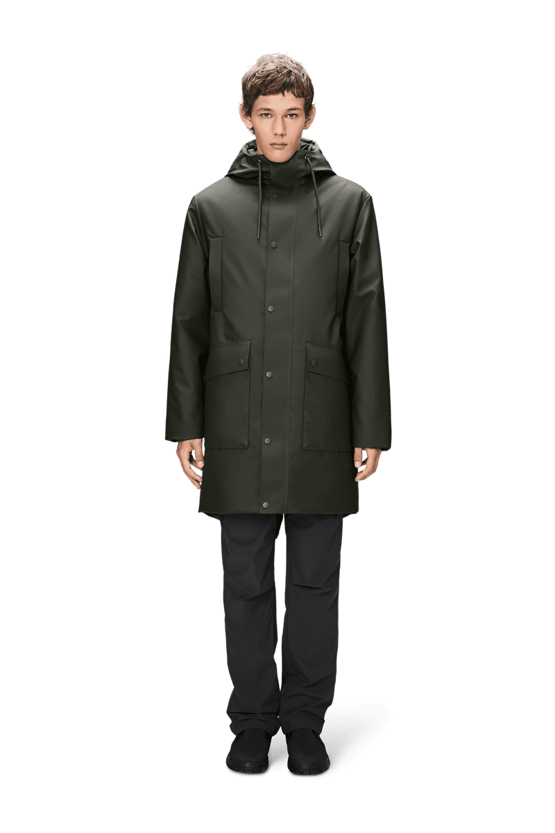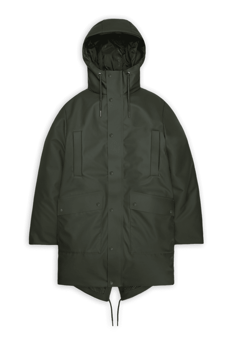 Ydermaterialet er Rains’ signatur PU-stof med en robust vævet bagside, som giver både vandtæthed og holdbarhed. Parkaen har fladt polstret foer for komfort og varme, hvilket gør den velegnet til bypendling og udendørsbrug i koldt og fugtigt vejr.
